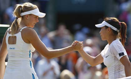 Zheng Jie of China (R) shakes hands with Nicole Vaidisova after defeating her in their quarter-final match at the Wimbledon tennis championships in London July 1, 2008. [Agencies]