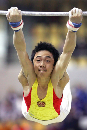 China's Zou Kai competes in the high bar event during the 39th Artistic Gymnastics World Championships in Aarhus, Denmark October 14, 2006. [Reuters]