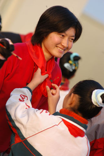 Olympic 10,000-metre gold medallist Xing Huina is greeted by a pupil at the opening ceremony of the Xing Huina Hope Elementary School at Shizixing Village in Weifang, East China's Shandong Province, Thursday, November 9, 2004. The school is funded by the China Sportspersons' Education Fund, which was founded by former Chinese world and Olympic champions. [newsphoto]