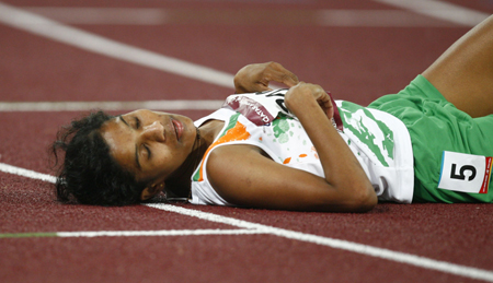 India's Jaisha Orchatteri Puthiya Veetil lies on the track after the women's 5000m final at the 15th Asian Games in Doha December 11, 2006. Veetil took the bronze medal. [Reuters]