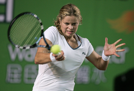 Kim Clijsters of Belgium plays a shot to Zheng Jie of China during their quarter-final of the Champions Challenge tennis tournament in Hong Kong January 3, 2007. [Reuters]