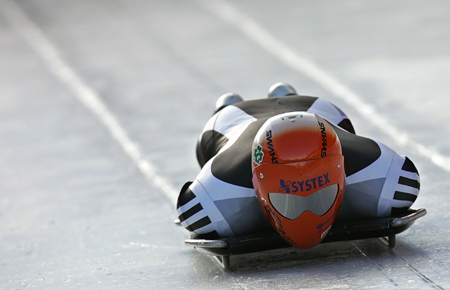 An athlete trains for the upcoming skeleton world cup tour at the Olympic track in Cesana Pariol, northern Italy, February 7, 2007. [Reuters]