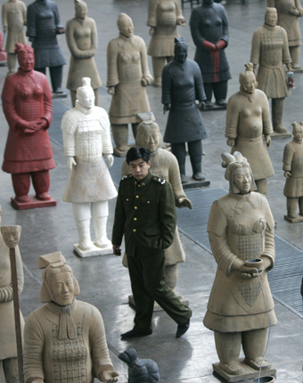soldier walks amid terracotta warriors sculptures by Norwegian artist Marian Heyerdahl at a gallery in Beijing in this March 2, 2007 file photo. From the back, this army of contemporary terracotta warriors looks as forbidding as the ancient battalion that was buried with a warring Chinese emperor to lead in the afterlife. But these all-female soldiers, created by Norwegian artist Marian Heyerdahl and on display in Beijing, carry a completely different message than the famed, original Qin dynasty statues with their pained faces, pregnant bellies and mutilated bodies. [Reuters]