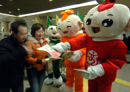 Volunteers in cartoon figures'customs send around the flysheet to passengers at Beijing Wangfujing metro station to promote the second official "Queue Day" in Beijing March,11,2007.The "Queue Day" to remind residents of the benefits of lining up for things. Experts say the days should be introduced in other cities to provide people with a better understanding of social etiquette. [Xinhua]