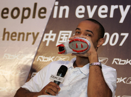 Arsenal soccer star Thierry Henry holds a soccer boot during a news conference for a promotional event in Beijing May 30, 2007. [Reuters]