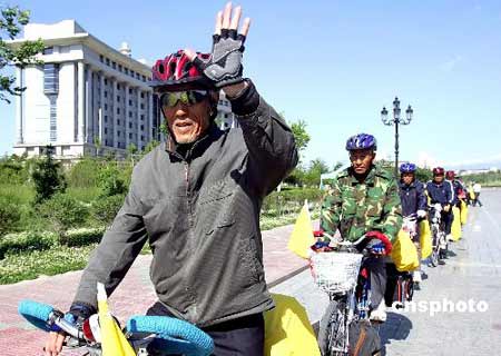 Eight senior citizens from Hami, Xinjiang Uygur Autonomous Region arrived at Urumchi by bike after 7 days cycling journey on May 29. They plan to finish a more than 2,000-kilometer long cycling trip around Xinjiang within 40 days to promote 2008 Beijing Olympic Games.