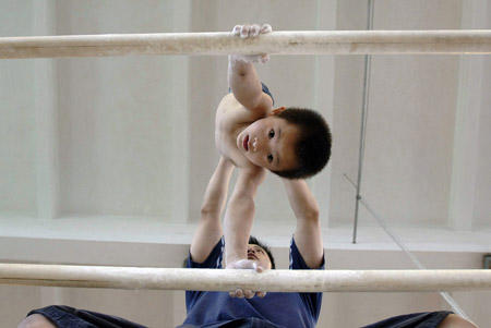 August 2, 2007. About 30 gymnasts, aged from 4 to 19, undergo training at