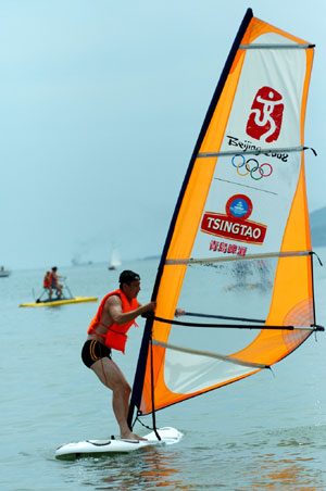 A tourist tries to control a sailboard marked with the Chinese Seal of Beijing Olympics on 24 July, 2006.[Xinhua]