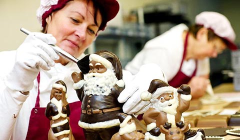 Handmade chocolate Christmas sweets are pictured at the chocolaterie Hammelspring in Hammelspring in the region Uckermark, Germany. [Photo/icpress]