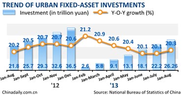 China's urban fixed-asset investment grew 20.3 percent year on year in first eight months, up 0.2 percentage point from the figure for the first seven months.