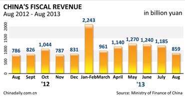 China's fiscal revenue climbed 9.2 percent year-on-year in August to 858.8 billion yuan ($138.52 billion), the Ministry of Finance said on Wednesday.