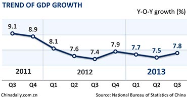 China's gross domestic product growth accelerated to 7.8 percent in the third quarter, up from 7.5 percent in the second quarter.