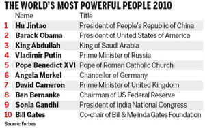 Forbes magazine has named President Hu Jintao as the world's most powerful person, a move that analysts say shows global acknowledgement of China's contribution to the world's economic recovery.