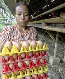 A worker collects eggs at a chicken farm outside Jakarta February 5, 2004.