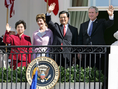 U.S. President George W. Bush (R) and Chinese President Hu Jintao (2nd R) wave along with their wives Liu Yongqing (L) and first lady Laura Bush (2nd L) as they stand on the Truman balcony of the White House after official South Lawn arrival ceremonies at the White House in Washington April 20, 2006. [Reuters]