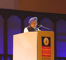 Manmohan Singh (R) addresses the opening ceremony of the 39th Annual