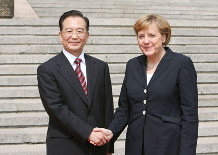 Premier Wen Jiabao (L)shakes hands with German Chancellor Angela Merkel