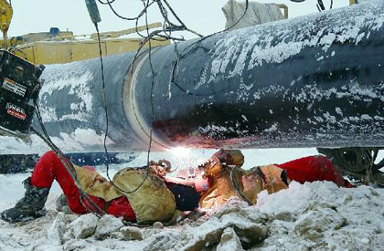 A worker performs on a welding operation of the China-Kazakhstan oil pipeline in this undated photo. The costs for the 960-kilometer pipeline amounted to US$700 million and the designed capacity is to pipe 20 million tons of oil to China each year. [Xinhua]