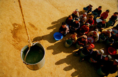 water from a water tanker at a remote village in Minxian County, Northwest