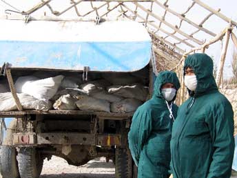 Epidemic prevention workers prepare to put killed poultry on trucks in Hetian of northwest China's Xinjiang Uygur Autonomous Region, Nov. 15, 2005. Highly pathogenic bird flu epidemic was reported in Hetian City of the Xinjiang Uygur Autonomous Region, the Chinese Ministry of Agriculture said on Thursday. [Xinhua]