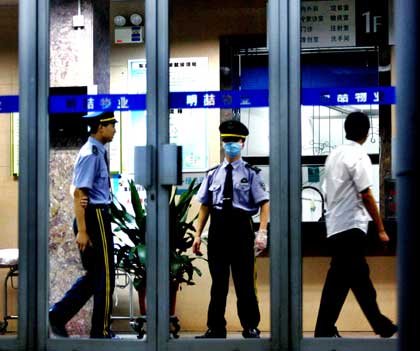 A security guard wearing respirator stands on duty at Donghu Hospital in Shenzhen, Guangdong province June 13, 2006. The suspected bird flu patient is undergoing treatment at the hospital. [newsphoto]