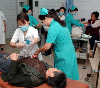 treatment on patients poisoned by leaked chlorine at a hospital in Yinchuan,