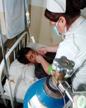 treatment on a patient poisoned by leaked chlorine at a hospital in Yinchuan,