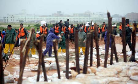 Soldiers repair the destroyed dam in Jinjiang, East China's Fujian Province July 25, 2006. Typhoon Kaemi landed in Weitou Town of Jinjiang City at 3:50 p.m. July 25.[Xinhua]