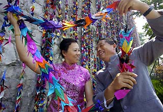 string of paper cranes in Nanjing on July 30, 2006. Local community