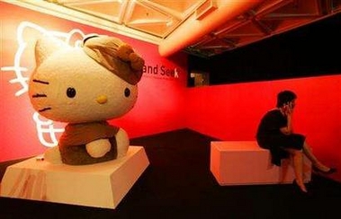 A visitor sits next to a Hello Kitty exhibit during the celebration of the 30th anniversary of the Japanese cartoon character in Hong Kong August 17, 2005. [Reuters]