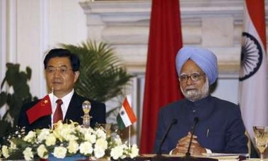 India's Prime Minister Manmohan Singh (R) speaks beside China's President Hu Jintao during a joint address to the media in New Delhi November 21, 2006. India and China agreed on Tuesday to boost trade and renew efforts to solve their border dispute, adding there was enough room for the Asian giants to grow together while remaining sensitive to the other's concerns. [Reuters]