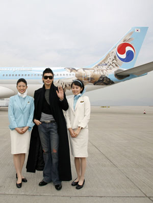 South Korean pop star Rain poses with flight attendants in front of a Korean Air's airplane featuring an illustration of himself upon his arrival at the Hong Kong airport January 10, 2007. Rain will perform three concerts in the city starting Friday, the first stop in Asia for his world tour.[Reuters]