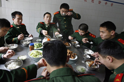 Firefighters eat lunch in the dining room of a fire station in Shanghai February 20, 2007. Chinese cities have been gradually loosening firework restrictions, instituted over decade ago due to fire and safety concerns. The Chinese New Year festival is the busiest time for firefighters, a local Shanghai fire station's commander said. [Reuters]