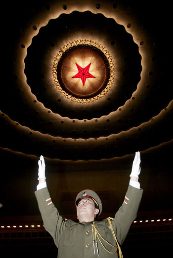 A Chinese military band conductor prepares to perform before the opening of the Chinese People's Political Consultative Conference in Beijing March 3, 2007. [Reuters]