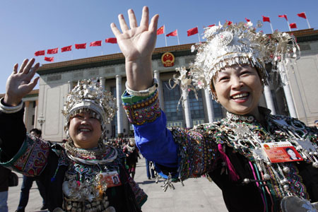Ethnic minority delegates wave as they walk away from the Great Hall of the people in Beijing at the end of the opening ceremony of the National People's Congress March 5, 2007. [Reuters]