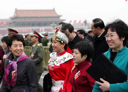 Deputies to the National People's Congress walk to the Great Hall of the People in Beijinig for the closing ceremony of their annual session March 16, 2007. The lawmakers adopted two landmark laws -- the property rights law and the corporate income tax law. [Xinhua]