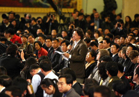A reporter raises questions to Premier Wen Jiabao at the news conference after the closing ceremony of the National People's Congress annual session at the Great Hall of the People in Beijing, March 16, 2007. [Xinhua]
