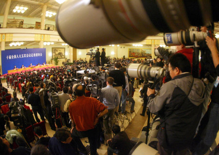 Journalists and photographers cover the news conference after the closing ceremony of the National People's Congress annual session at the Great Hall of the People in Beijing, March 16, 2007. [Xinhua]
