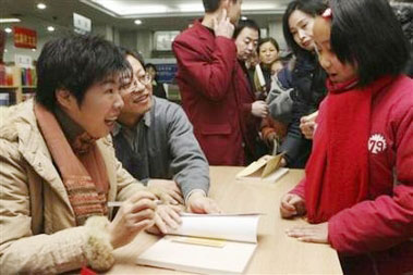 Yu Dan (L), a professor from Beijing Normal University, signs an autograph for readers at a book store in Xi'an, northwest China's Shaanxi province, in this January 24, 2007 file photo. [newsphoto]