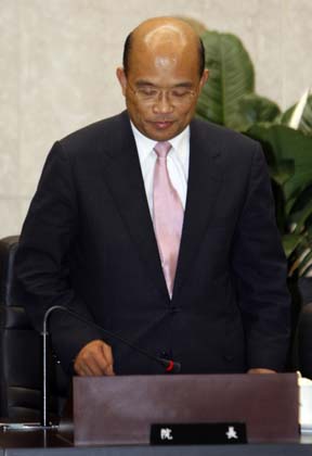 Taiwan "premier" Su Tseng-chang looks down after a news