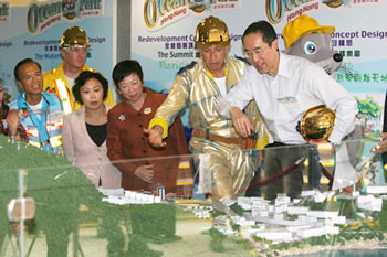Officials look on as park chairman Allan Zeman (second from right) and Financial Secretary Henry Tang (right) discuss plans. [file]