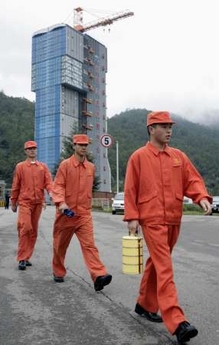 Staff walk past the launch pad with Long March 3A rocket and orbiter, the Chang'e One, which are under wrap inside at the Xichang Satellite Launch Centre in Southwest China's Sichuan Province October 18, 2007.[Agencies]