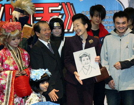 Japanese Prime Minister Yasuo Fukuda's wife Kiyoko (C) poses with costume players after she receives her caricature from a student while she visits Japan-China animation comic book exhibition in Beijing December 28, 2007. [Agencies]