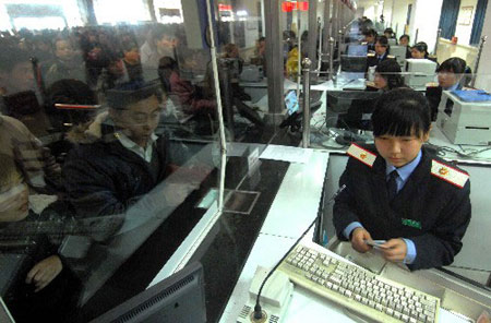 A staff sells train tickets as passengers wait in line at a railway station on Sunday, in Hangzhou, East China's Zhejiang Province, January 13, 2008. Train tickets for this year's Spring Festival travel peak season go on sale from Sunday evening, the Beijing Times reported. [Xinhua]