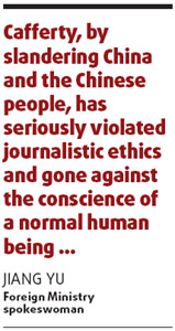 Jiang said Cafferty, by slandering China and the Chinese people, has "seriously violated journalistic ethics and gone against the conscience of a normal human being, which reflects his arrogance, ignorance and hostility".