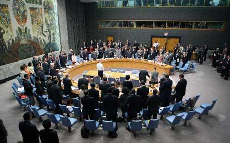 Members of the Security Council of United Nations observe a moment of silence in remembrance of the victims of the recent earthquake in China as they begin a meeting at U.N. Headquarters Tuesday, May, 20, 2008. [Xinhua]