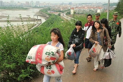 Earthquake survivors carry their belongings to move to higher grounds as the drainage has begun at the swollen Tangjiashan quake lake at Mianyang in Southwest China's Sichuan Province on Saturday June 7, 2008. [Agencies] |