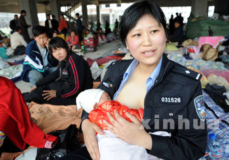 Jiang Xiaojuan, a policewoman, is feeding an infant with breast milk after the May 12 quake. [Xinhua]