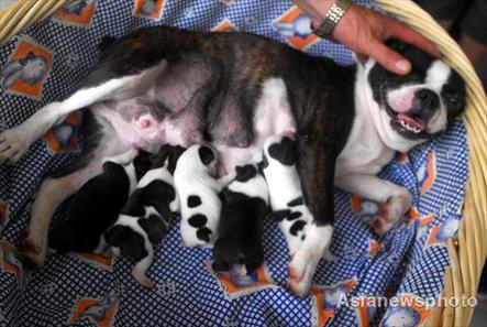The hero mother feeds her five new-born puppies at a home in Hainan Province, August 8, 2008. [Aisanewsphoto]
