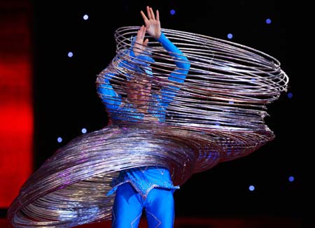 Jin Linlin, hula hoop Guinness World Records keeper, perform at the closing ceremony of the 2008 Beijing Dahongmen International Clothing Festival, in Beijing, capital of China, on October 20, 2008. [Xinhua]